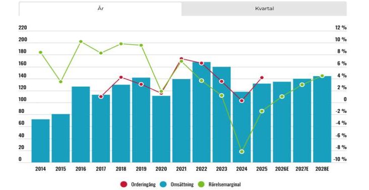 För 2026 skissar vi på 2% tillväxt och kommande år penslar vi in 3-4% tillväxt. Marknaden spås som helhet att växa med runt 5% årligen jämförelsevis.