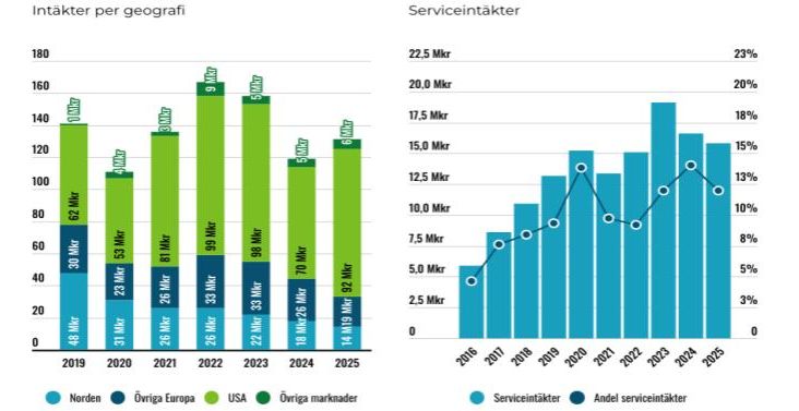 Den amerikanska marknaden gick dock starkt 2025 och intäkterna steg 32% till 92 Mkr (70). Medan Europa och Norden tappade 25% respektive 21%.