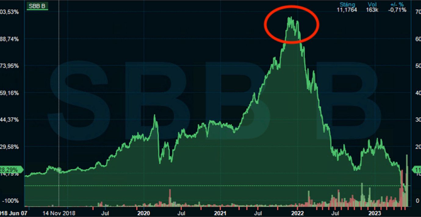 Högtryck i börsens fastighetssektor under coronaåret 2021 eldar på uppgången för SBB:s aktie. (Infront)