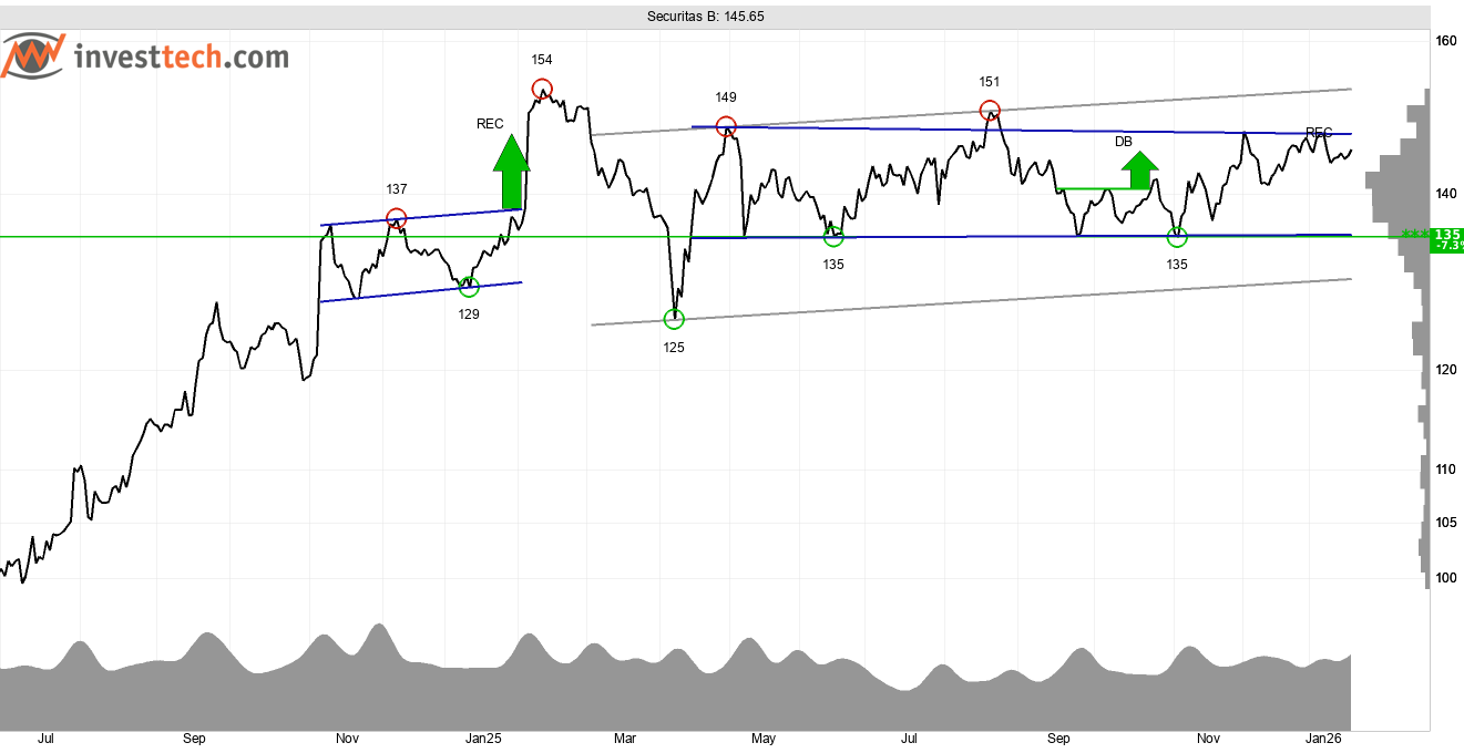 Säkerhetsbolaget Securitas B-aktie är tekniskt mycket intressant inför att resultatet för 2025 förväntas presenteras den 4 februari. Aktien har under lång tid rört sig sidledes, där 135 kronor utgör stöd och 150 kronor motstånd. Dessa nivåer utgör också golv och tak i en rektangelformation. Brott upp genom 150 kronor kommer utlösa stark köpsignal från kursformationen. Sett till investerarpsykologin signalerar brottet om en injektion i optimism bland investerarna. Den underliggande tekniska bilden är god med en positiv trendbild och en positiv volymbalans.