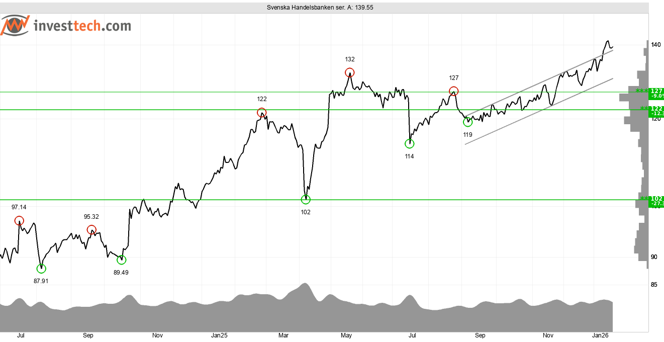 Handelsbanken uppvisar positiva utsikter inför att resultatet för 2025 förväntas offentliggöras den 4 februari. Optimismen är god bland investerarna som stadigt över tid handlat upp aktien. Detta återspeglas i en starkt stigande trend på hela skalan från kort till lång sikt. Aktien handlas i trakten av all time-high (141 kronor). Brott genom detta skulle ge ny köpsignal. Senaste köpsignalen utlöstes efter brott genom den tidigare toppnoteringen runt 132 kronor.