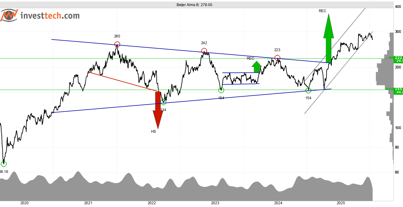 B-aktien till svenska industribolaget Beijer Alma har utvecklats starkt efter att ha fått köpsignal från rektangelformation i maj. Kursformationen signalerar om uppgång mot trakten av 400 kronor. Trendbilden är starkt positiv och får stöd av en positiv volymbalans. Aktien handlas sedan i oktober i en konsolidering mellan stödet vid 266 kronor, och motståndet vid 297 kronor. Brott genom motståndet kommer utlösa ny köpsignal med potential till fin uppsida.