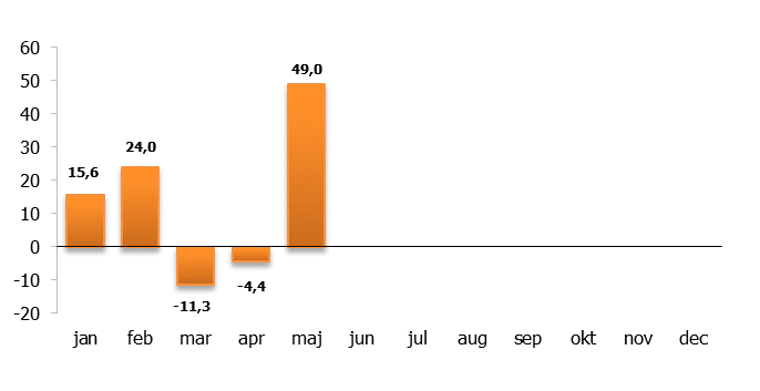Nysparandet i fonder uppgick till 49 miljarder kronor i maj. Störst nettoinflöde hade aktiefonder och långa räntefonder. Det visar statistik från Fondbolagens förening.