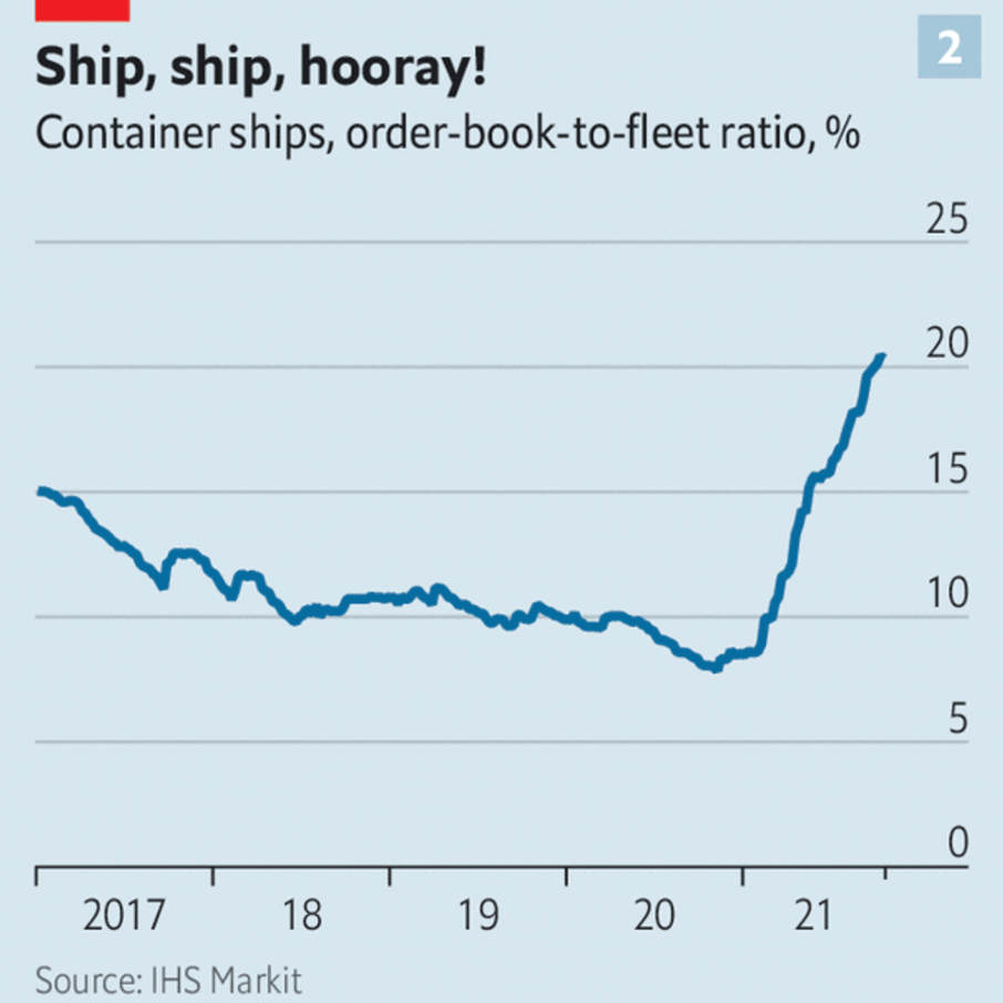 The big question is how much new capacity is in the offing. As world trade boomed in the years before the financial crisis of 2007-09, order books were roughly equivalent to 60% of the existing fleet. They now stand at a little over 20%. Restraint is due in part to uncertainty over the technology needed to make vessels which have a 25-year lifespan compliant with tougher carbon-emissions rules that the industry is expecting. Still, capital discipline may have its limits. Orders have begun to swell again (see chart 2). But it will take two to three years before ships ordered today start rolling down slipways. The era of pricey shipping could well last for another Christmas or two.