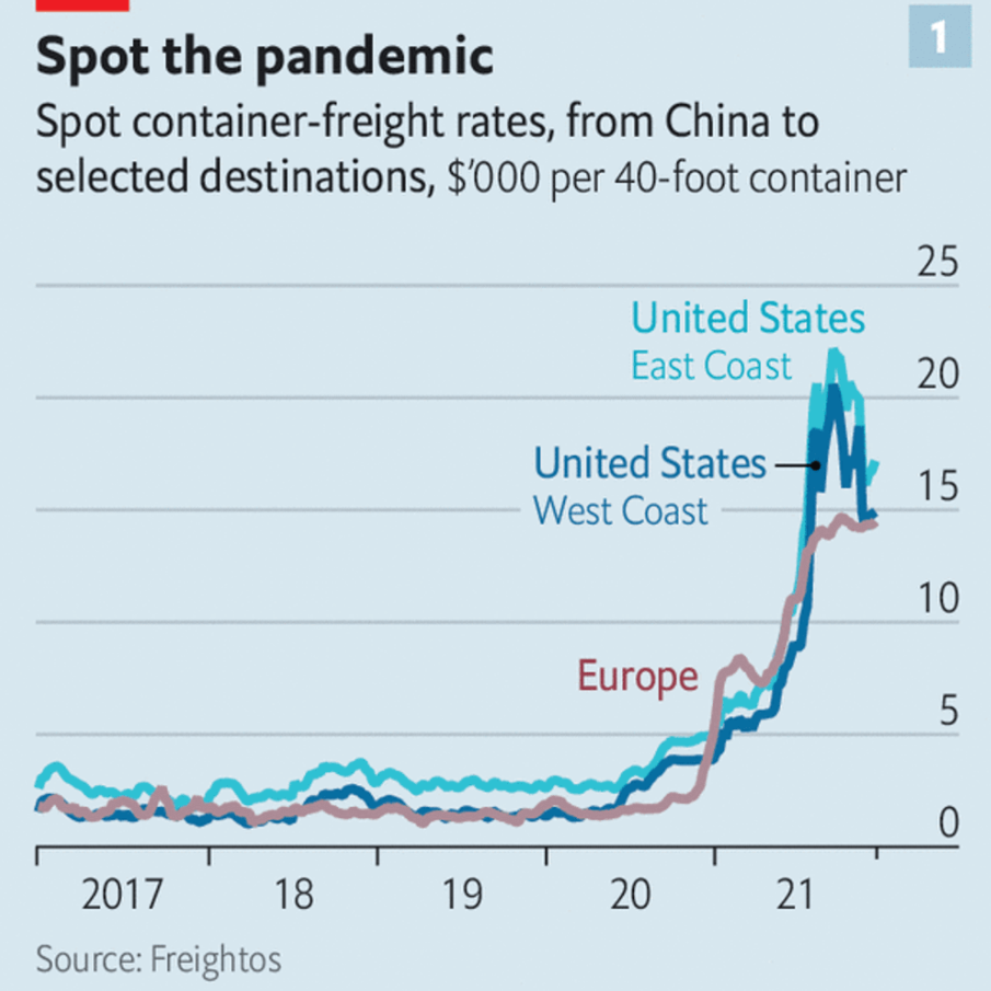 The result is that shipping rates are not coming back to earth. A set of benchmark spot rates from Freightos, a digital freight marketplace, between China and America’s west coast are below a recent peak. But at around $15,000 per feu (40-foot equivalent unit), they are ten times pre-pandemic levels (see chart 1). The outsize appetite for goods in America has had a knock-on effect elsewhere. A shortage of vessels, drawn by high rates to the trans pacific routes, has pushed the cost of sending boxes between China and Europe to record levels. That raises costs for businesses that rely on shipping firms. Small items such as smartphones or sports shoes can be packed by the tens of thousands into a container. But a rough estimate of the average value of goods in a box travelling between China and America is around $50,000. Another $15,000 makes a significant difference.