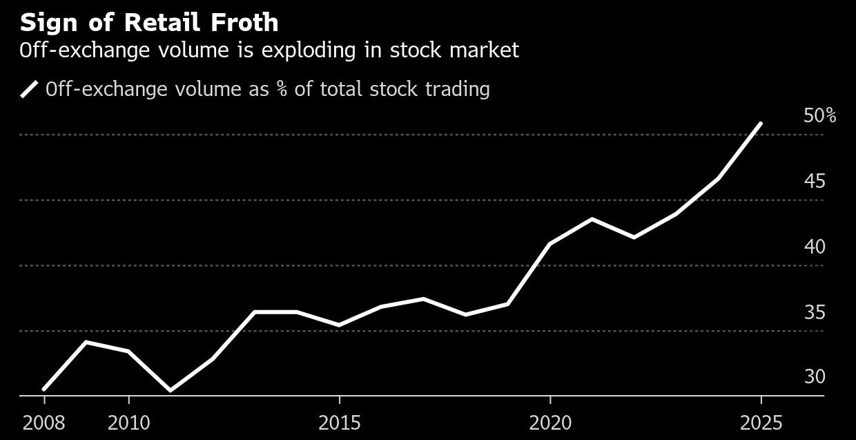 One proxy for retail involvement in the market is the volume of stocks executed by off-exchange venues such as those run by equity wholesalers serving clients like Robinhood Markets Inc. Those trades are poised to make up 50% of the total this year for the first time ever, data compiled by Bloomberg show.