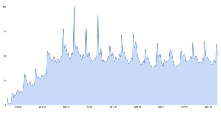 Sökintresset på Google för Iphone 2007–2024. (Källa: Google Trends)