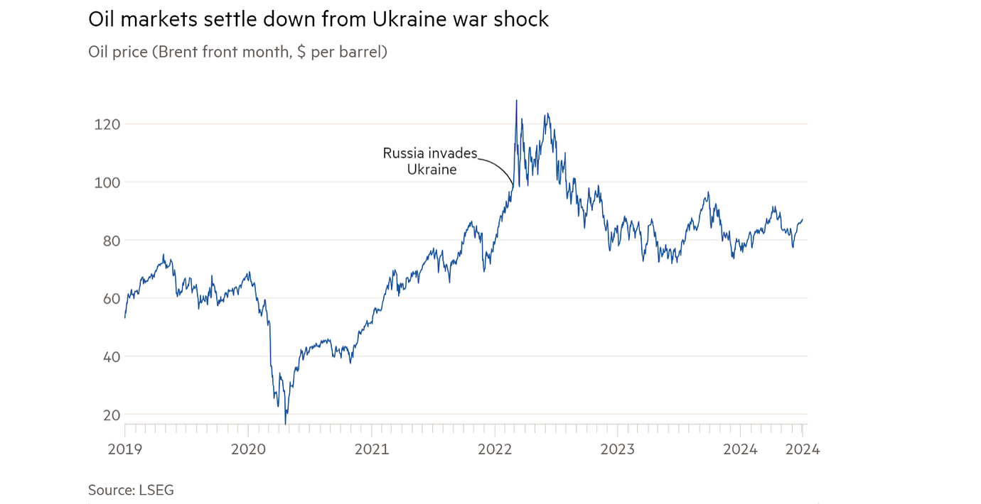 A barrel of Brent crude oil costs less than it did the day before Russia invaded Ukraine. Stock indexes across the developed world have surged to record highs. The biggest winner of the rally has been Nvidia, the US chip designer that generated almost half of its revenues in 2023 from China and Taiwan and has repeatedly cautioned about the negative impact of US-China trade tensions. Government bond investors have shrugged off repeated warnings about spiralling US debt levels.