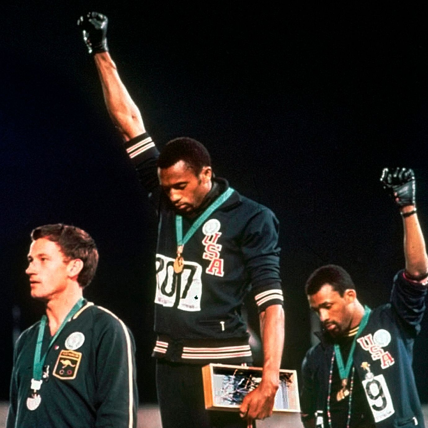 1968 Tommie Smith and John Carlos give a clenched fist salute after winning gold and bronze in the 200m at the Mexico City Olympics