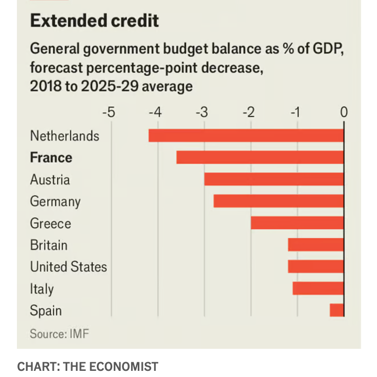 All countries have now submitted fiscal-consolidation plans to the European Commission. The French one is ambitious, aiming to cut the deficit by 0.5 percentage points of GDP a year, enough to stabilise the debt level. At the moment, however, such a plan looks politically impossible. And the French government is not the only one coming to terms with its budgetary constraints. Germany’s recently collapsed, too, because of spending disputes. Italy will feel the strain in the next few years.