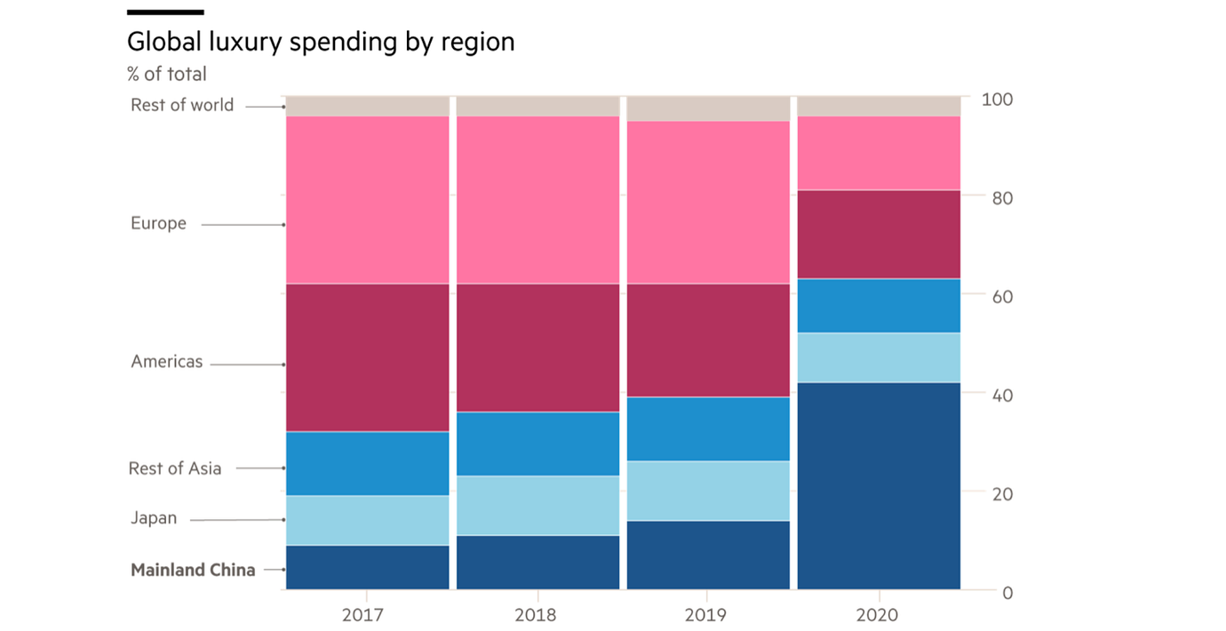 Asien och primärt Kina har kommit att bli den största drivkraften för lyxindustrin. Den asiatiska marknaden för lyxvaror har vuxit till ett värde av 300 miljarder dollar, exklusive bilar, och står för 60 procent av den globala lyxmarknaden.