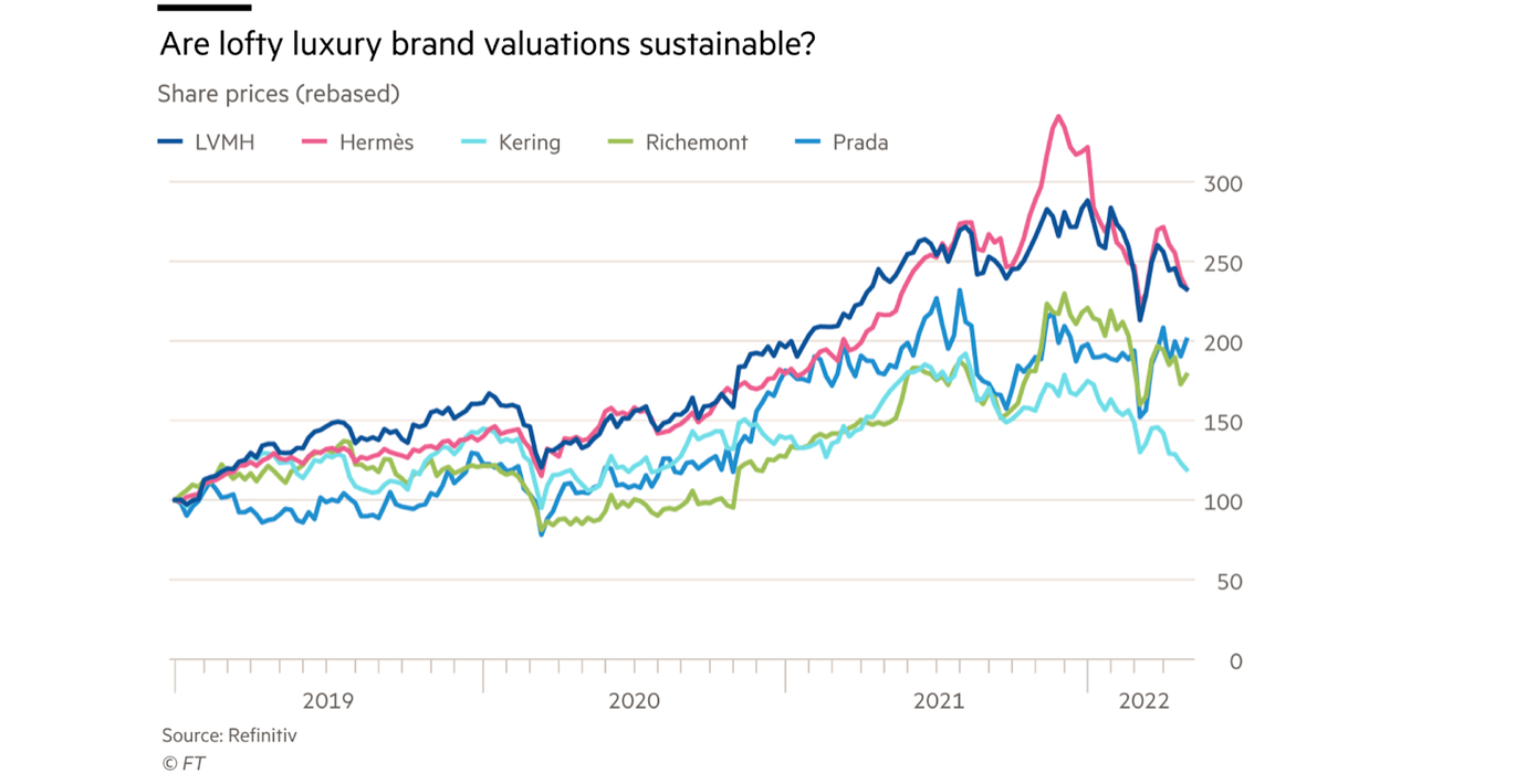 That in turn helped boost the value of shares in Europe’s luxury groups. LVMH and Hermès reached decade high valuations last year on a forward earnings basis, with the latter reaching 65 times at the end of 2021, reflecting the buying frenzy in Asia. Current valuation levels, while short of those highs, imply that the current double-digit earnings growth will continue.