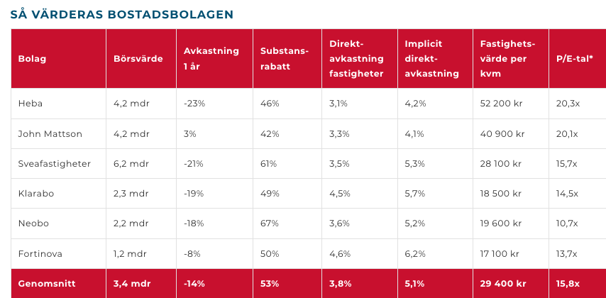 Bostadsaktierna handlas nu till mycket stora rabatter mot substansvärdet, på mellan 40% och 70%. Ungefär så har det sett ut ända sedan räntorna började stiga, då marknaden blev orolig för fastighetsbolagens skuldsättning och värdet på deras tillgångar.