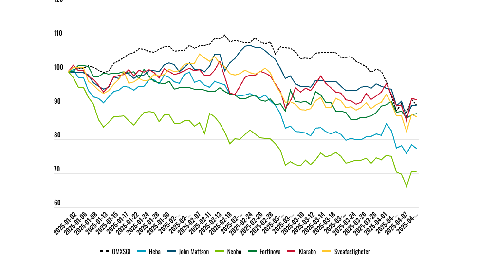 Bostadsaktierna har gått svagt under stora delar av 2025 och föll kraftigt i mars då räntorna steg snabbt – exempelvis 5-åringen som på två dagar rusade från runt 2,0% till 2,4% över oro att försvarsupprustning och tullar skulle leda till inflation.