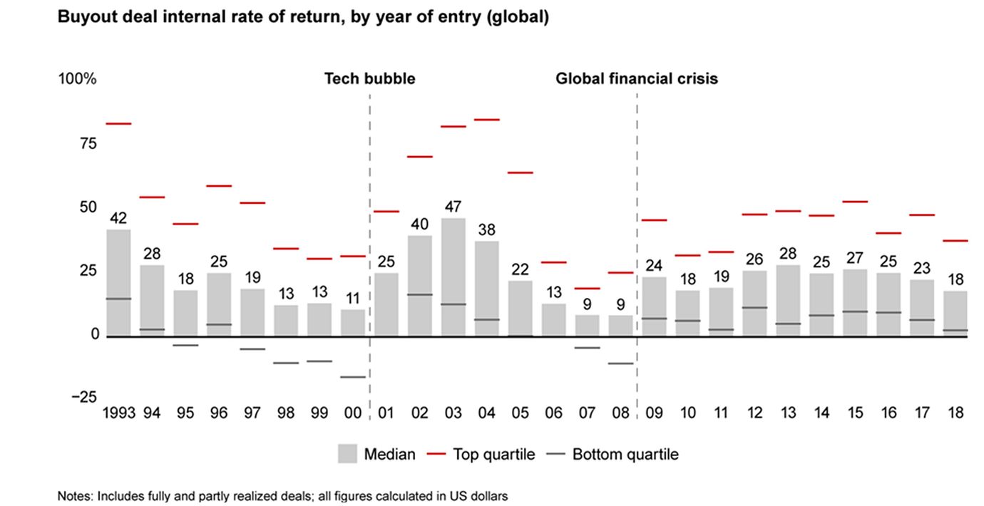 En bild säger som bekant mer än tusen ord. Nedan graf visar IRR-avkastningen som investerare har haft på ”Buyout”-deals (en Private Equity-strategi) under olika marknadscykler.