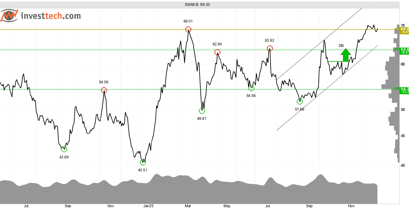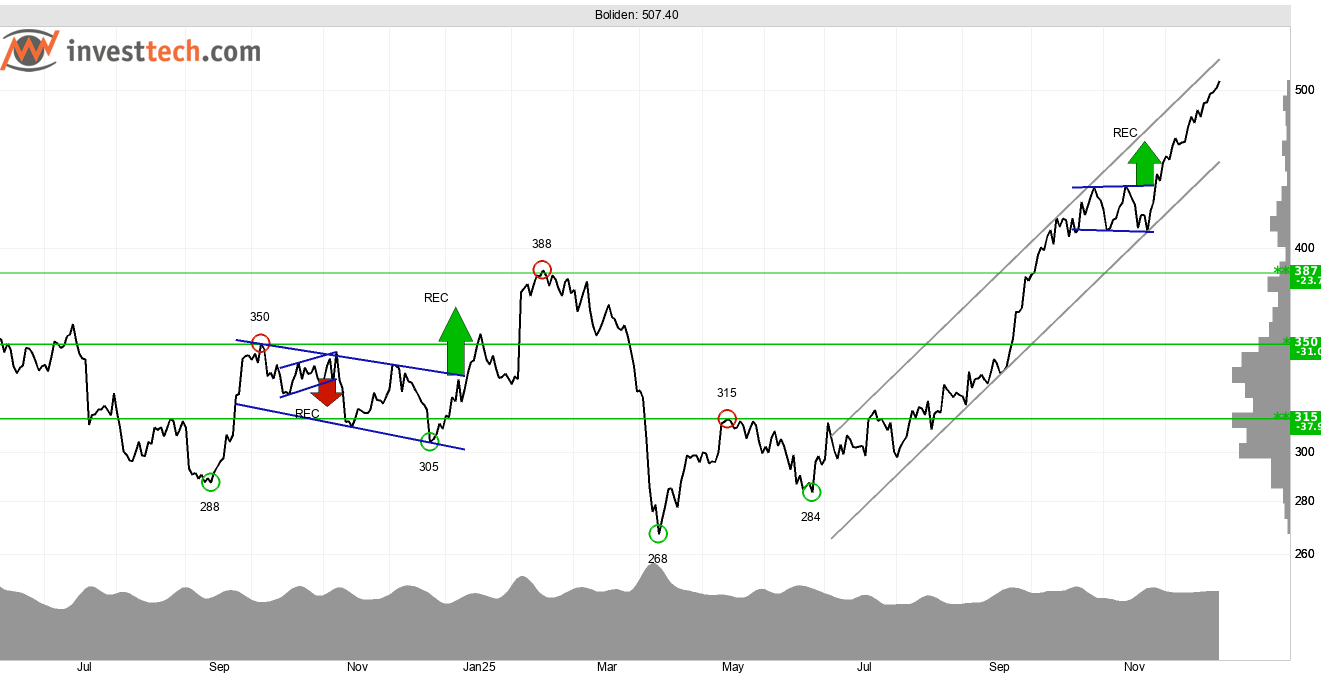 På aktienivå ser gruvbolaget Boliden och ståljätten SSAB intressanta ut, med köpsignaler i graferna och trendkanaler som pekar uppåt.