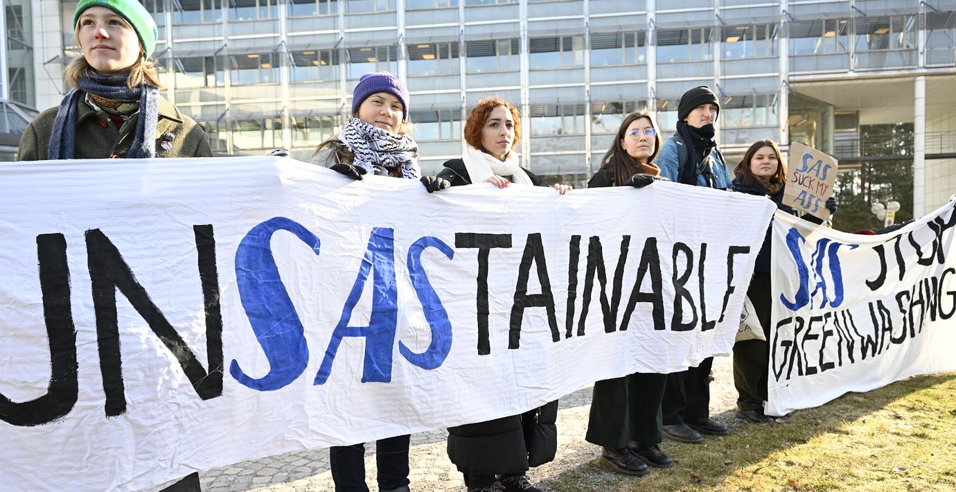 Klimataktivisten Greta Thunberg och ett tjugotal andra klimataktivister från Fridays for future demonstrerade utanför flygbolaget SAS årsstämma i Solna på måndagen.