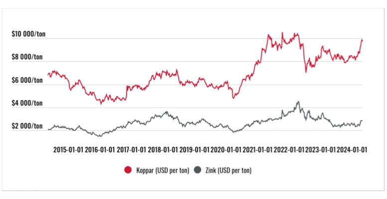 Boliden har inte några väsentliga prissäkringar. En investering i Boliden ger därför en ganska rak exponering mot marknadspriserna på bolagets metaller. I tabellen nedan har vi modellerat hur olika koppar- och zinkpriser slår mot bolagets intjäning.