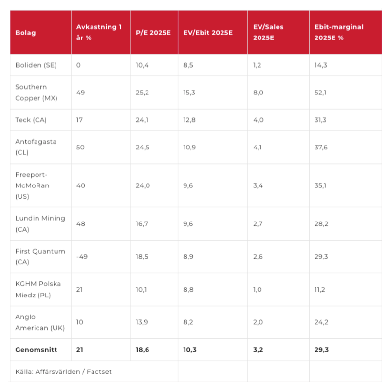 I tabellen nedan framgår hur Boliden och några andra större västerländska basmetallproducenter värderas enligt analytikerkonsensus i Factset.