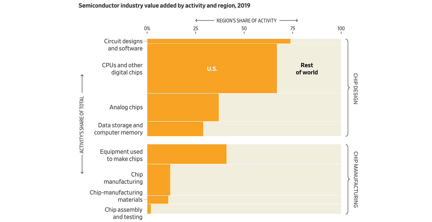 American scientists and engineers invented and commercialized semiconductors starting in the 1940s, and today U.S. companies still dominate the most lucrative links in the semiconductor supply chain: the design of chips, software tools that translate those designs into actual semiconductors, and, with competitors in Japan and the Netherlands, the multimillion-dollar machines that etch chip designs onto wafers inside fabrication plants, or fabs.