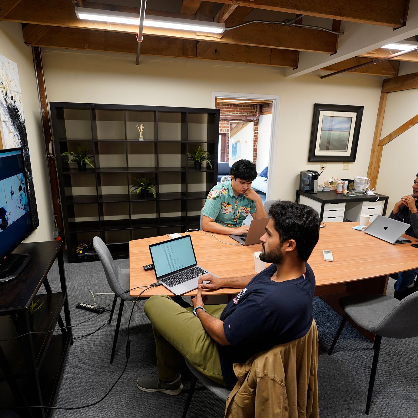 RunX CEO Ankur Dahiya, center, takes part in a video meeting with employees JD Palomino, top left, and Nitin Aggarwal, right, at a rented office in San Francisco, Friday, Aug. 27, 2021. Technology companies like RunX that led the charge into remote work early as the pandemic unfurled, are confronting a new challenge as it winds down: how, when and even whether they should bring their long-isolated employees back to offices that have been designed for teamwork.  (Eric Risberg / TT NYHETSBYRÅN)