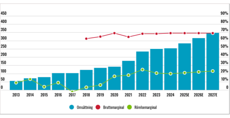 Med en bruttomarginal på nästan 70% finns potential till god skalbarhet. Vi skissar på 21% marginal i år och 23% något år ut. Målet är som sagt minst 20% vilket också är i linje med snittet senaste fem åren.