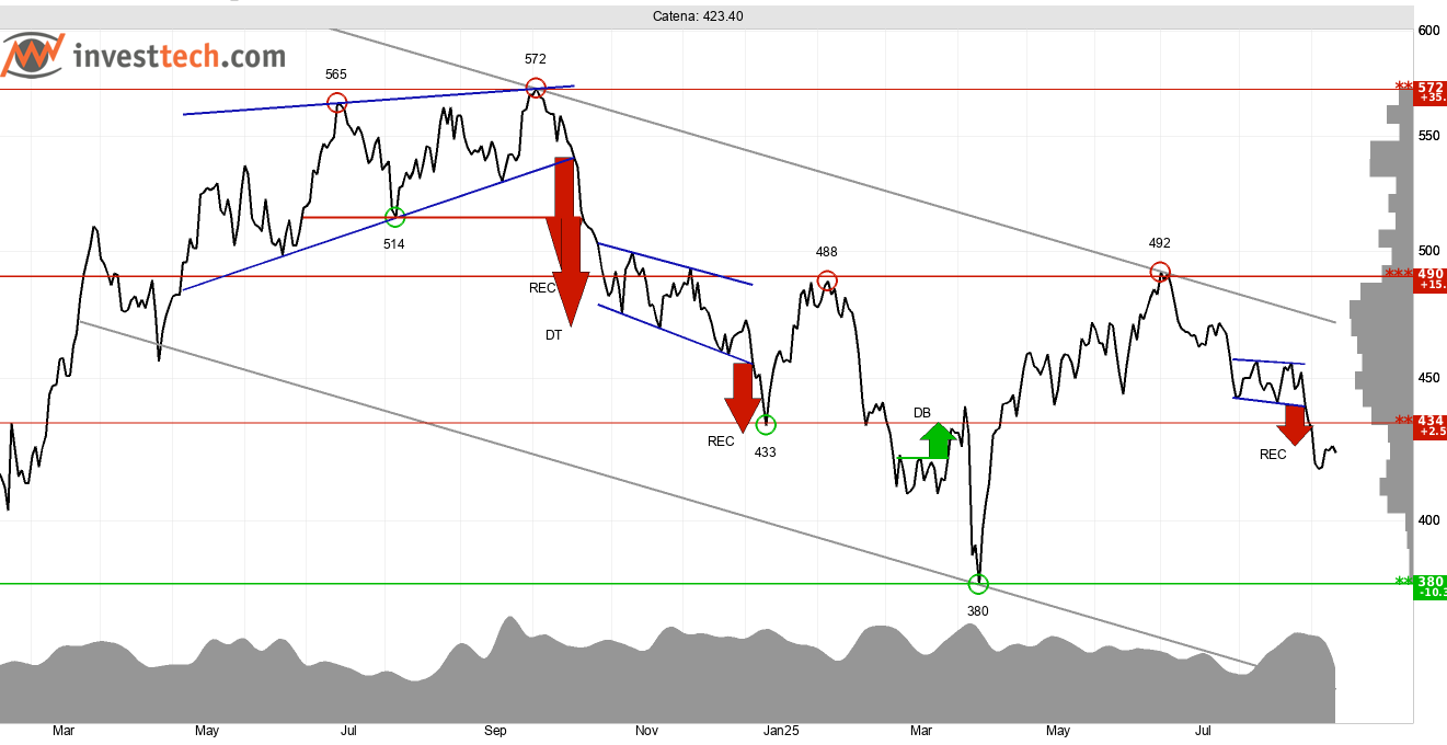 Catena, med verksamhet inom logistikfastigheter, uppvisar en fallande trend på medellång sikt, om än utvecklingen sett till senaste året varit övervägande horisontell. Brott genom stödet vid 434 kronor försvagar aktien. Det finns dock ljusglimtar: En lokal botten (så kallad pivotpunkt) är identifierad vid 418 kronor i grafen på kort sikt. Aktien har från denna nivå handlats upp under ökande volym, vilket kan vara en tidig signal om ökande optimism bland investerarna. En etablering ovanför 418 kronor och brott upp genom 434 kronor skulle stärka aktien. På nedsidan finns stöd vid 380 kronor.