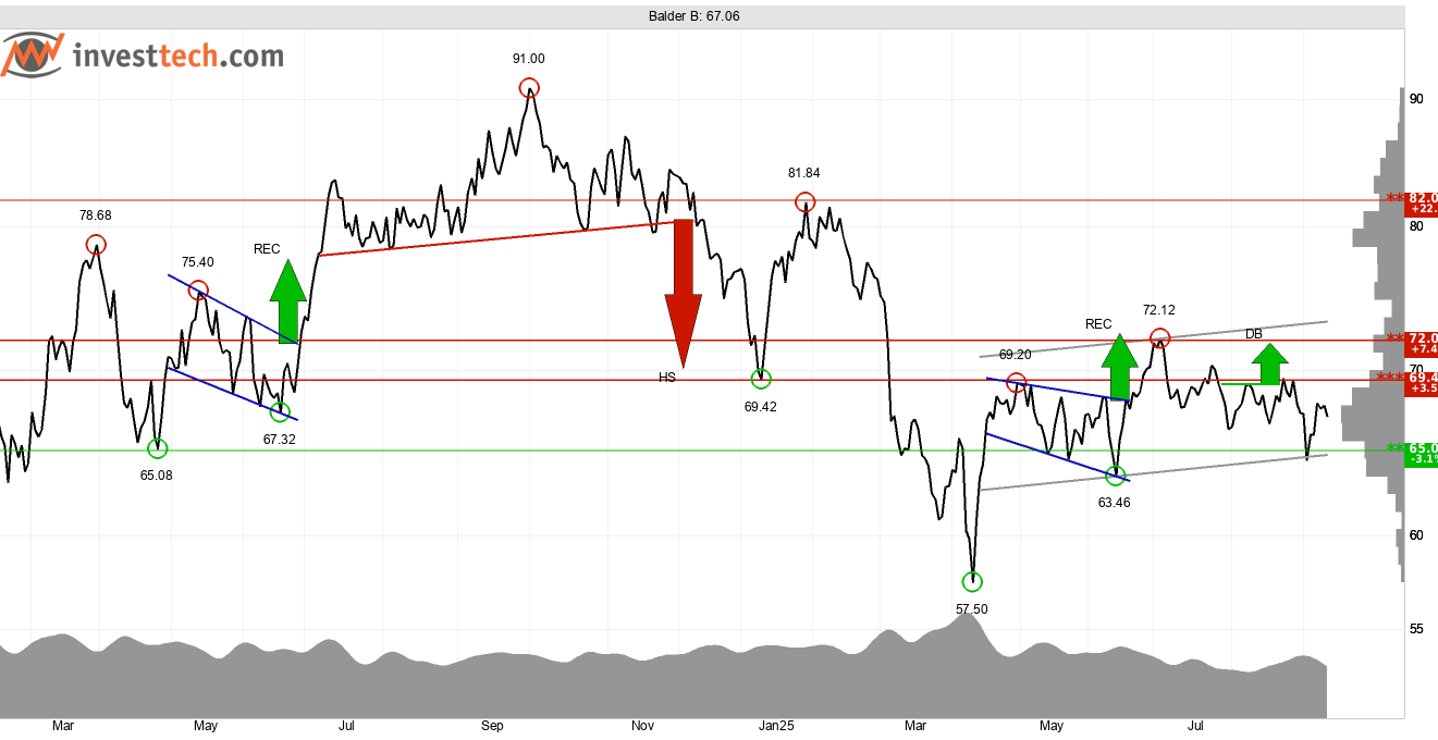 Balder har gått kräftgång på börsen efter att aktien toppade runt 91 kronor för knappt ett år sedan. Aktien handlas i dag mellan stödet vid 65 kronor och motståndet vid 69,40 kronor efter att ha rört sig horisontellt sedan i våras. Vi behöver se brott genom stöd- och motståndsnivåerna för indikation på kommande kursrörelse.