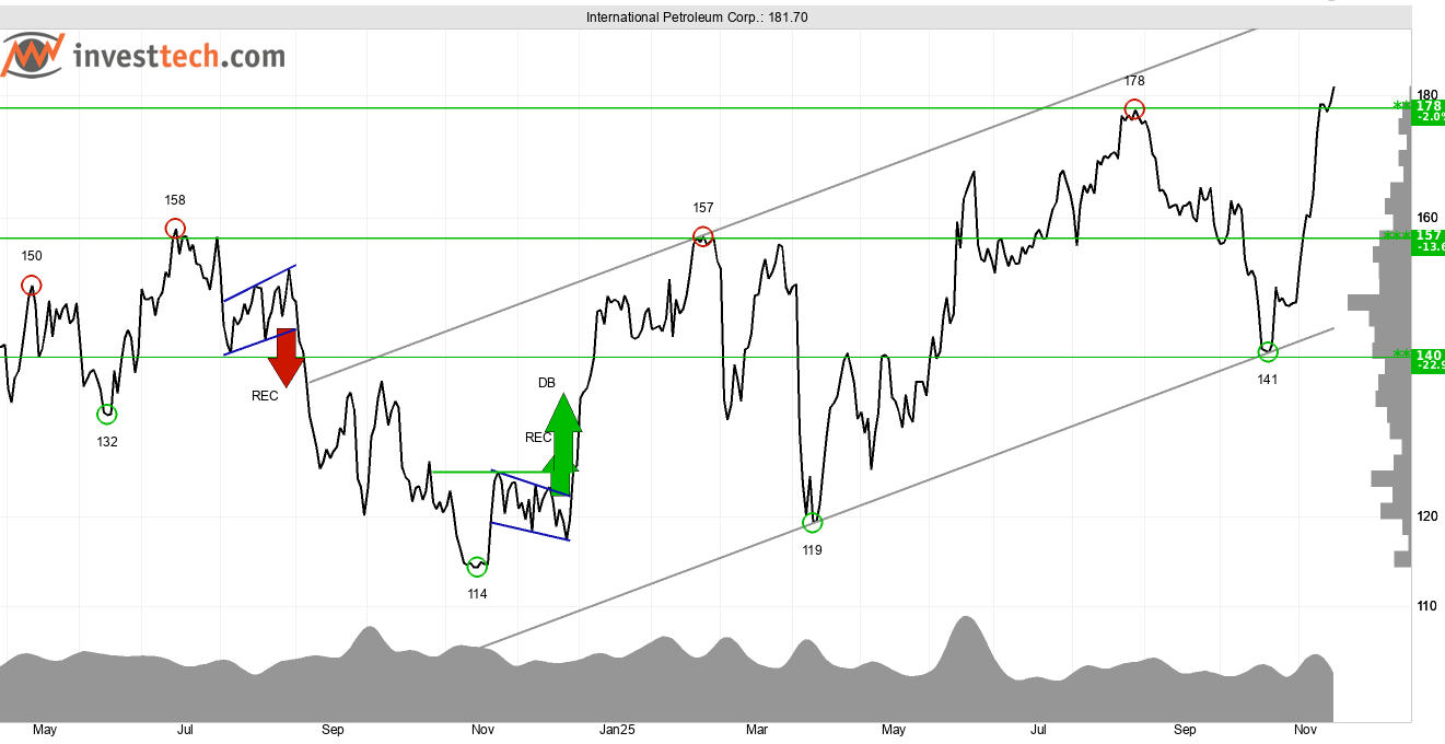 Det kanadensiska olje- och gasbolaget International Petroleum, som är listat på Stockholmsbörsens large cap-lista, uppvisar en positiv bild ur både ett tekniskt och kvantitativt perspektiv. Aktiekursen utvecklas inom en stigande trendkanal som Investtechs algoritm har identifierat på kursdiagrammen för medellång sikt och det signalerar en ökande optimism bland investerare. Det är en stark köpsignal enligt Investtechs mångåriga trendforskning.