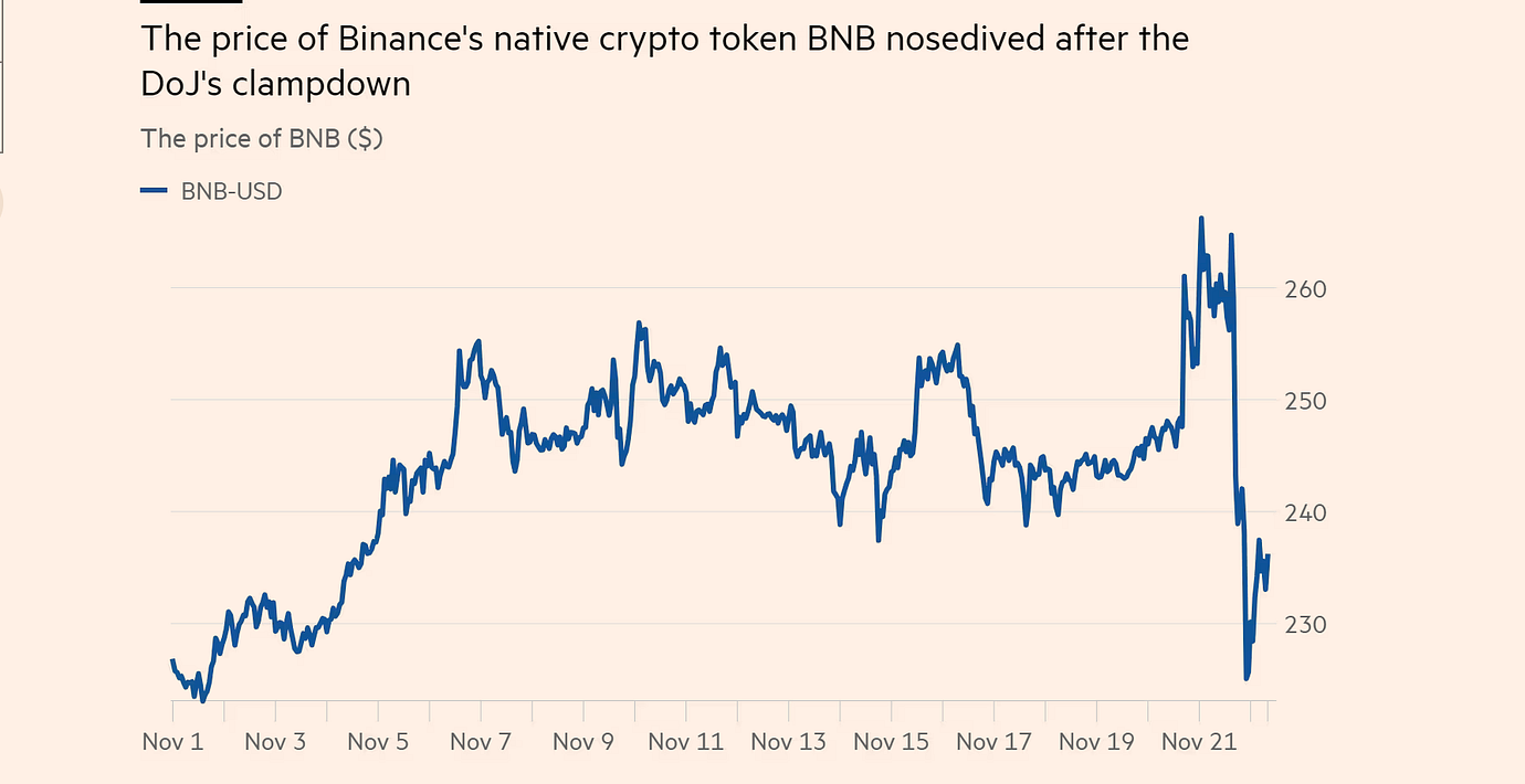 Binances förlikning med tre amerikanska myndigheter innebär – förutom en kostnad på 4,3 miljarder dollar – att grundaren Changpeng Zhao tvingas bort från vd-posten och att företaget sätts under övervakning. Samtidigt hotar fortfarande en stämning från amerikanska finansinspektionen, skriver Financial Times.