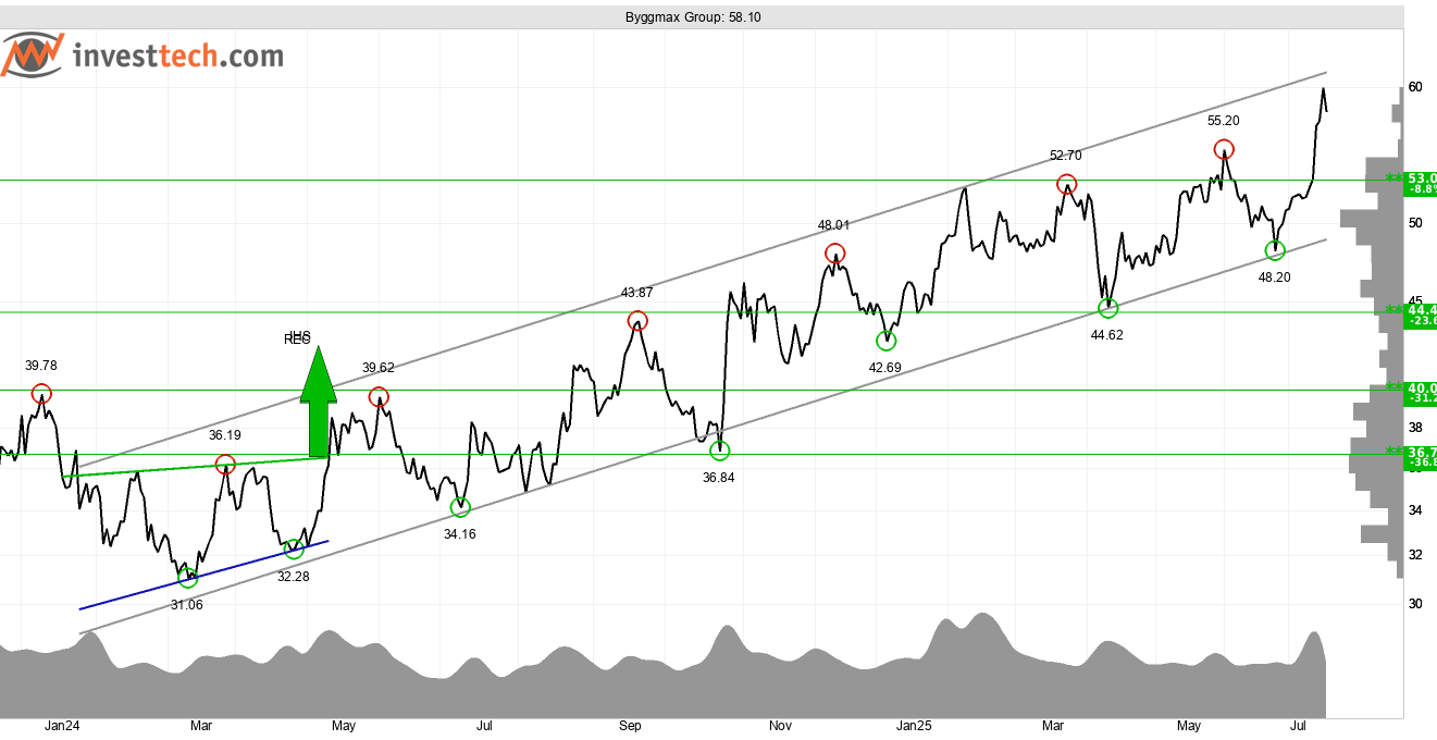 Byggmax Group uppvisar en fortsatt positiv trend på medellång sikt, med stöd av en stark volymbalans. Aktien har utvecklats positivt sedan Q2-rapporten den 10 juli, och brott av motståndsnivåerna vid 53–55,20 kronor har utlöst köpsignal. Momentumet är starkt – 21-dagars RSI ligger på 70 – vilket signalerar ökad optimism bland investerare.
