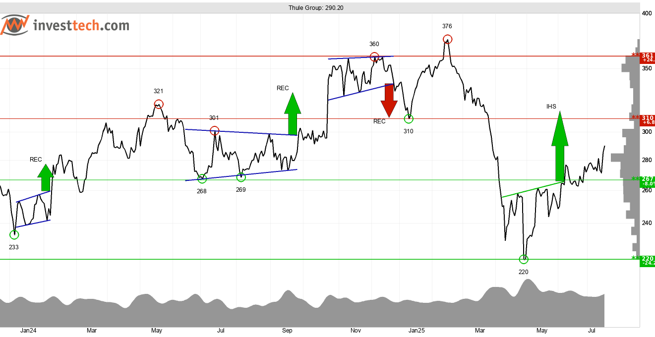 Thule Group är ett svenskt bolag som designar och säljer produkter som takboxar, cykelhållare, barnvagnar, ryggsäckar och taktält. Bolaget lade fram resultatet den 15 juli. Marknaden mottog denna positivt och handlade upp aktien 5,2 procent. Motståndet vid 277 kronor i grafen på kort sikt bröts därmed och köpsignal utlöstes. Den underliggande tekniska bilden är stark med köpsignal från kursformation (omvänd huvud-skuldra, IHS) utlöst i månadsskiftet maj/juni. Aktien gynnas vidare av en positiv volymbalans och ett positivt momentum. 310 kronor är nästa nivå att hålla koll på – brott genom denna öppnar för fin uppsida mot 361 kronor. 267 kronor är stöd.