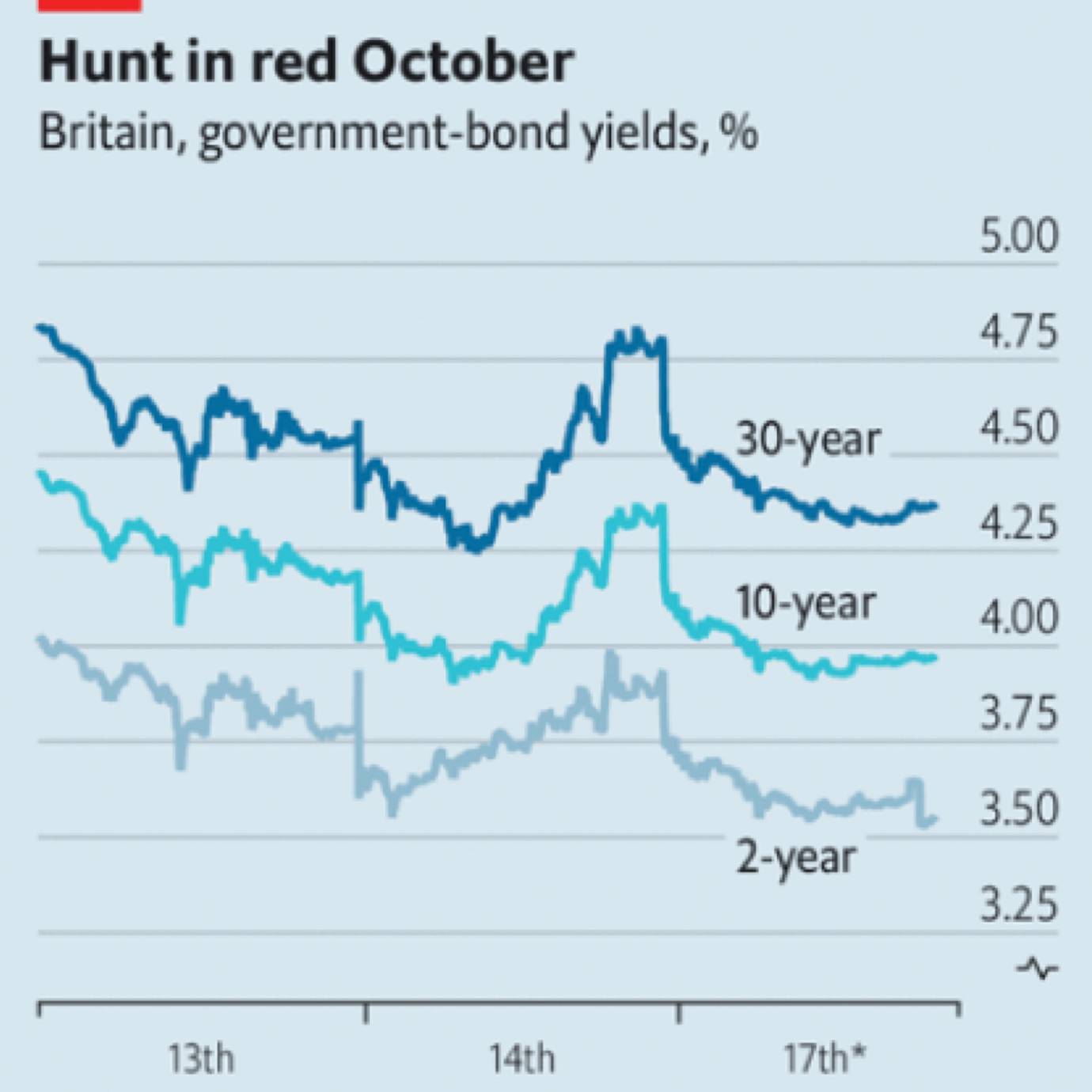 Mr Hunt was rushing to calm financial markets that his predecessor as chancellor, Kwasi Kwarteng, had well and truly spooked. Britain’s currency and its government debt (or “gilts”) cratered in the wake of the growth plan that Mr Kwarteng laid out on September 23rd. The gilt sell-off was so sharp that it forced some pension funds into fire sales, creating a self-reinforcing feedback loop and threatening financial stability. An emergency bond-buying programme from the Bank of England, along with Mr Kwarteng’s defenestration, went some way to restoring order. But as the central bank’s intervention came to an end on October 14th, gilt yields, which move inversely to prices, were rising ominously once again (see chart). Mr Hunt’s statement today was designed to reassure markets once and for all that the government is fully committed to fiscal responsibility.