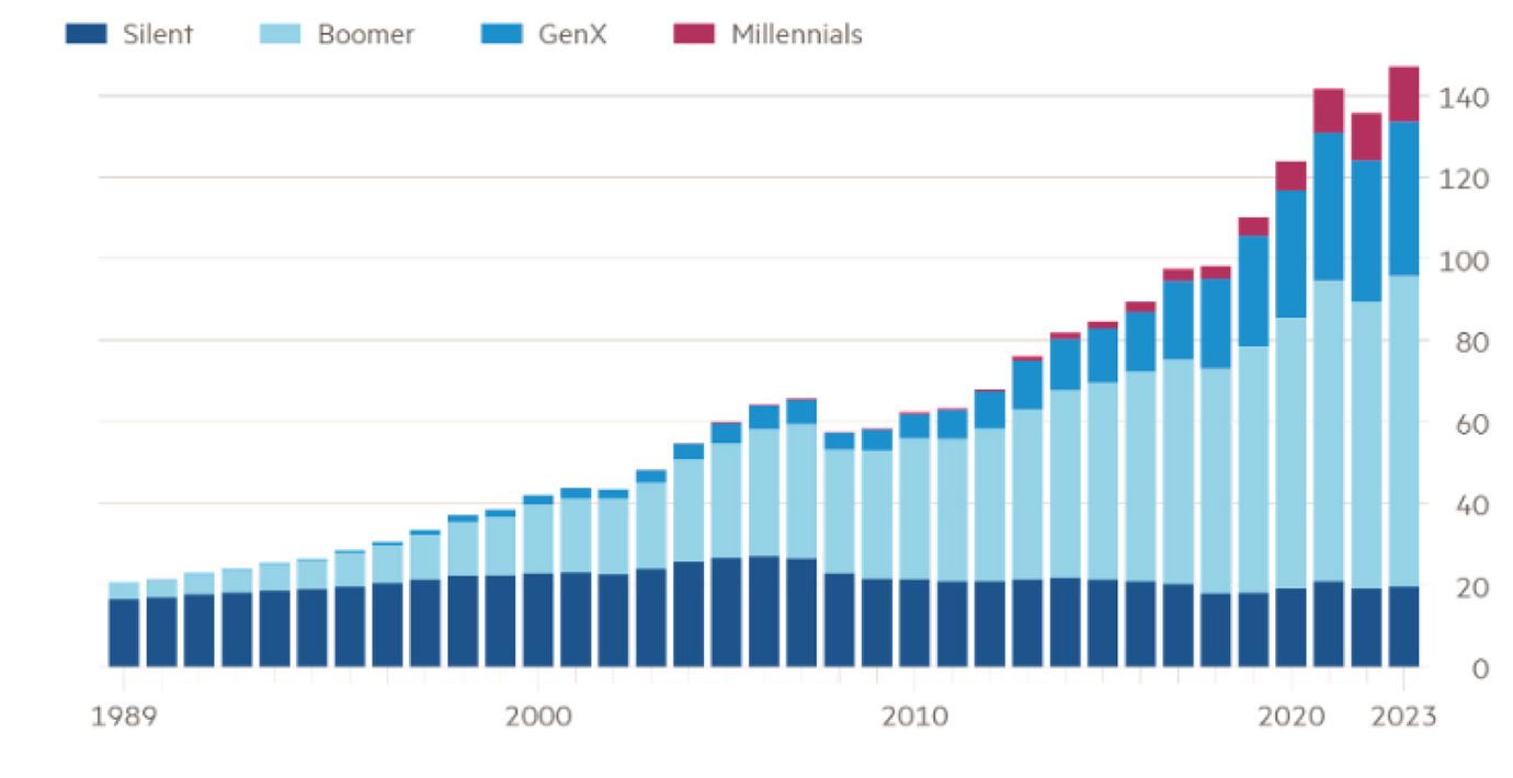 By 2045, around $90tn in the US alone is set to be transferred from those born before 1964 to their heirs, according to research by Cerulli Associates. Many argue that governments should target that wealth rather than taxing the incomes and consumption of younger generations often struggling with higher education and housing costs.