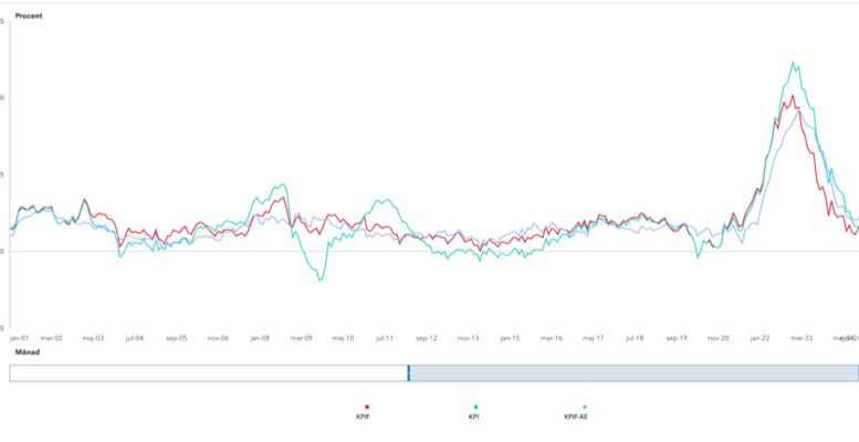 KPIFXE – konsumentprisindex beräknat med fast ränta samt exklusive energipriser. Energipriserna är volatila och kan ibland påverka utfallen kraftigt.