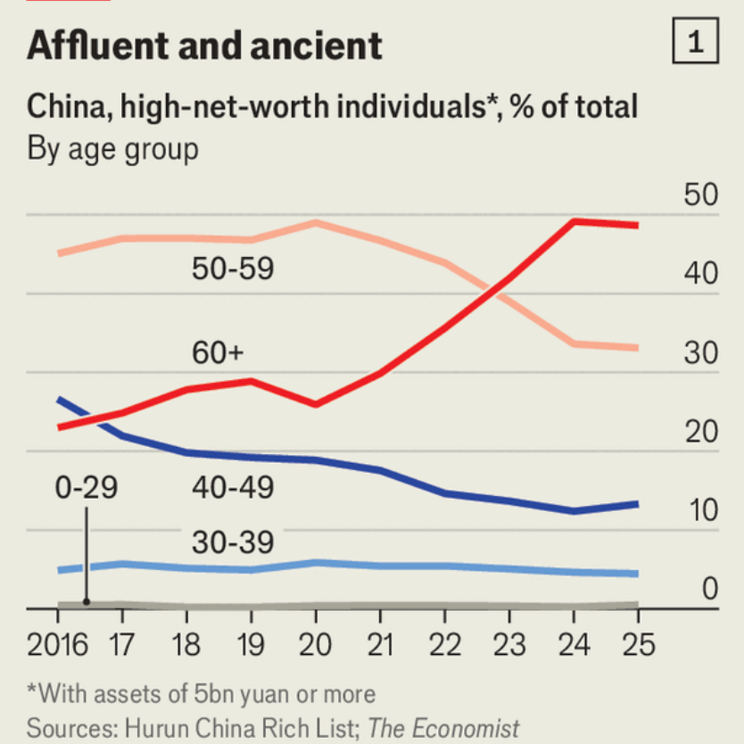 Almost none of that wealth is inherited. Fully 98% of billionaires in mainland China are self-made, compared with 66% in Hong Kong and 69% in Taiwan. But China’s wealth is in increasingly liver-spotted hands. Those 60 or older accounted for 49% of people worth at least 5bn yuan ($720m) in 2025, up from 23% in 2016, according to data from Hurun, a research firm (see chart 1). In the decade beginning in 2025, Chinese with a net worth of more than $5m will pass on $2.1trn, according to estimates from Altrata, a wealth-intelligence firm.