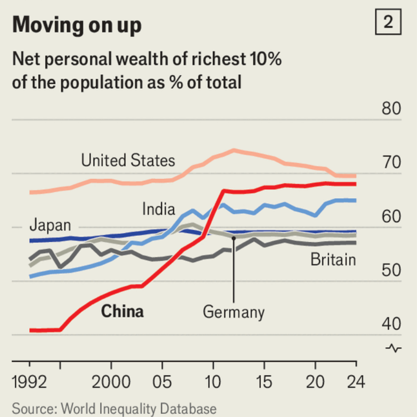 At any rate, wealth is becoming more concentrated. In 2024 the top 1% in China held 30% of the wealth and the top 10% held 68%, according to estimates from the World Inequality Database overseen by Thomas Piketty, a French economist. That’s up from 16% and 41%, respectively, three decades before (see chart 2).