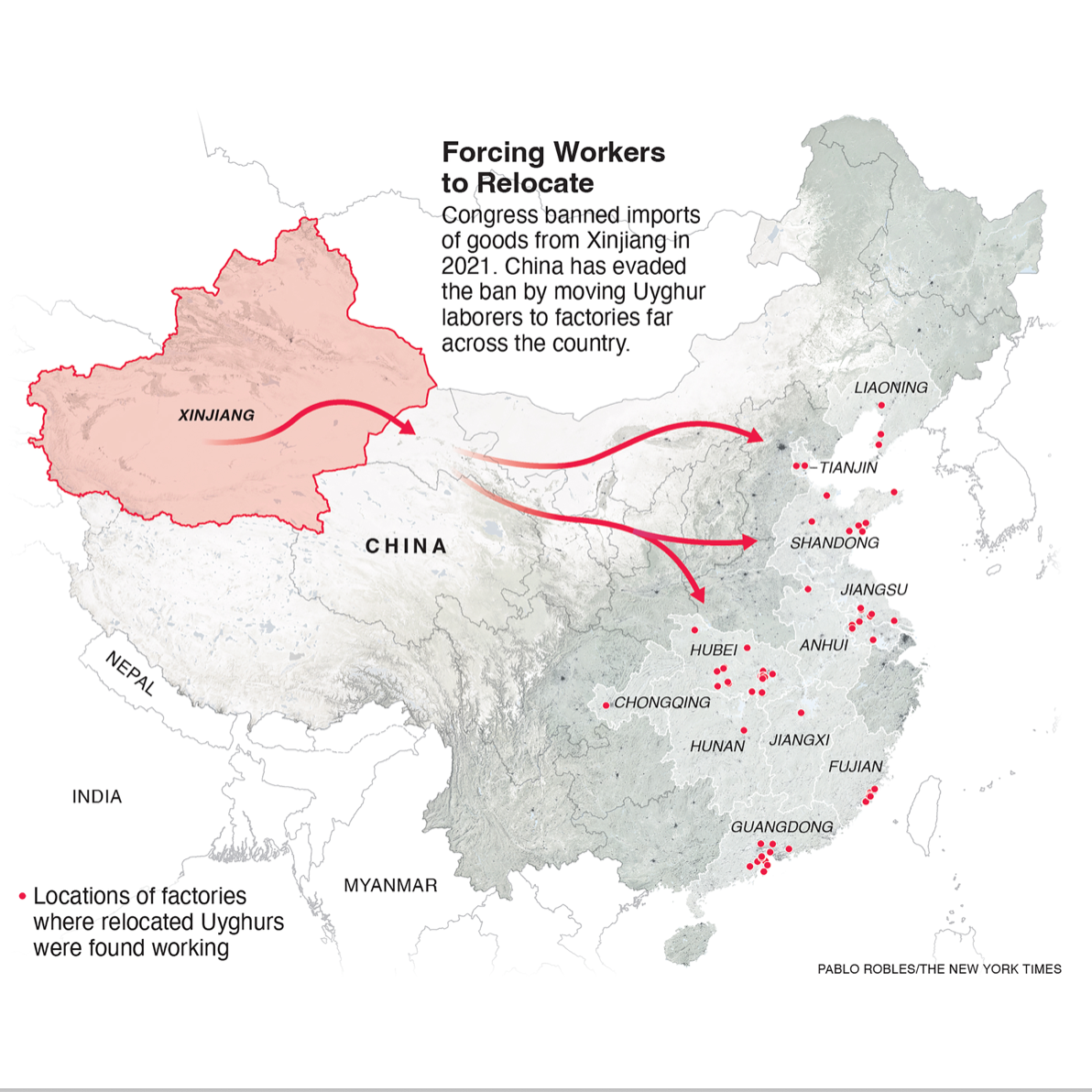 Sedan 2021 har den amerikanska kongressen förbjudit import av varor tillverkade i den kinesiska Xinjiang-provinsen, där den muslimska minoritetsbefolkningen utsätts för systematiska kränkningar och massövervakning. Nu kan The New York Times avslöja att Kina kringgår förbudet genom omfattande förflyttningar av uighurer från Xinjiang till fabriker i andra delar av landet.