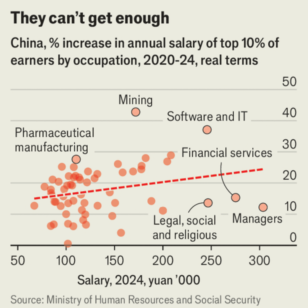 But the top tenth of software engineers by salary have seen their wages grow by 8% per year in real terms since 2020. The smartest engineers have enjoyed pay hikes amid a war for talent among China’s big-tech companies. An AI researcher at one such company in Beijing admits he has far more money than he knows what to do with (he spends most of his time at work and his hobby, hiking, is hard to splash cash on). DeepSeek, China’s AI darling, has been offering salaries of more than 1.4m yuan ($200,000) per year, over ten times that of the average white-collar worker in China.