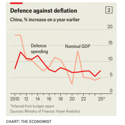 Boosting consumption is not the government’s only priority. Spending on science and technology will increase by another 10%, before adjusting for inflation. The budget for national defence will rise by 7.2%. In the past, China’s economy has kept pace with increased military spending, through a mix of real growth and inflation (see chart 2). As a result, the official military budget has remained fairly steady as a percentage of GDP, fluctuating around 1.3%. But now that China is suffering from slower growth and deflation, the equation has changed. Last year, for example, GDP grew by only 4.2% in nominal terms, before adjusting for changing prices.