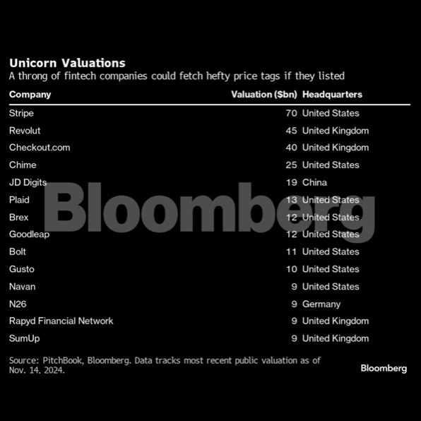 Other fintech firms are poised to move forward with their IPO plans. Zilch Technology Ltd. and Chime Financial Inc. are weighing first-time share sales in 2025, and executives from Plaid Inc. and challenger banks Revolut Ltd. and Zopa Bank Ltd. have signaled they are considering listings. Trustly Group AB‘s owner is exploring options for the fintech including a sale or IPO, Bloomberg News has reported. Brex Inc. and Ramp Business Corp. are also considering eventual IPOs.