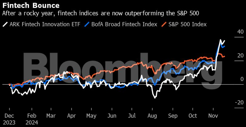 Other fintech stocks have also been on the rise. Bank of America Corp.’s BofA Broad Fintech Index is up around 36% this year, while the Ark Fintech Innovation ETF is up about 38%. Both are outperforming the S&P 500.