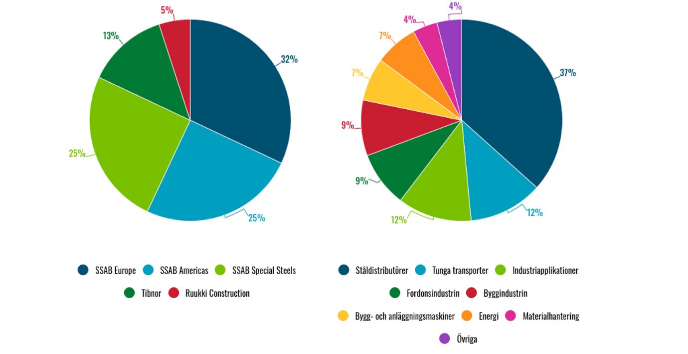 I grafiken nedan framgår hur SSAB:s omsättning fördelar sig per affärsområde samt bransch.