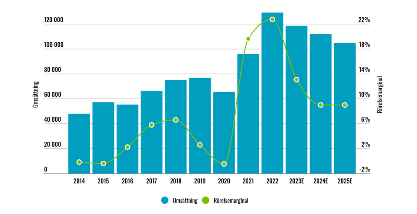 Om man justerar för meganedskrivningen var rörelseresultatet 29 miljarder. Under 2023 har omsättning och rörelsemarginal sjunkit något.