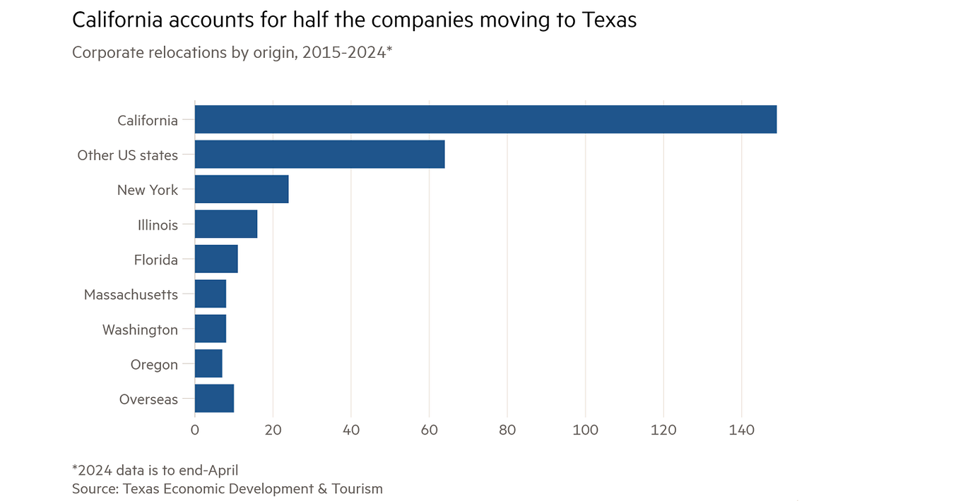 Texas har lockat hundratals företag med låga skatter och få regleringar, däribland Tesla, Oracle och HP. Det har gjort delstaten till ett ekonomiskt nav i USA, skriver Financial Times.