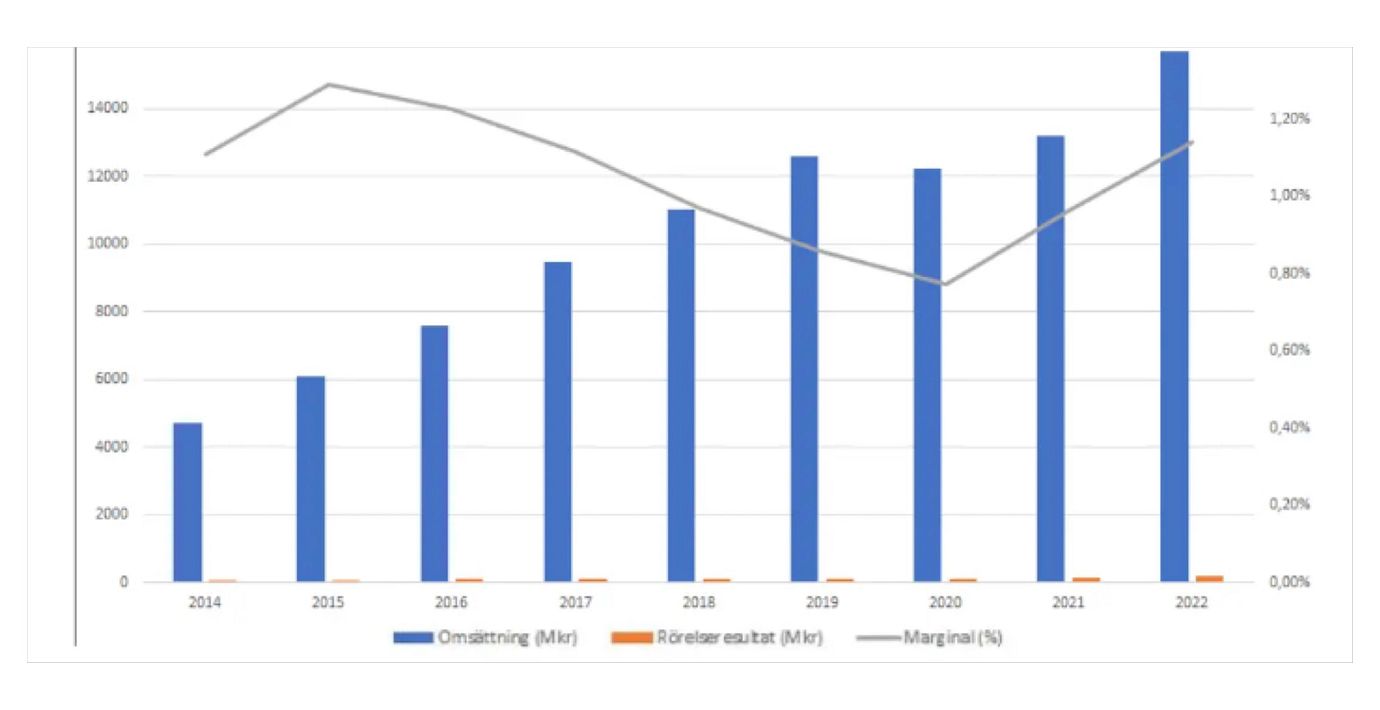 Ser vi till utvecklingen hittills under 2023 så ser vi att omsättningen ökat med drygt 10 procent under årets första nio månader, trots tuffa jämförelsetal. Rörelseresultatet har dock ”bara” stigit med 6 procent så någon större skalbarhet syns ännu inte. Och i Q3 isolerat så var tillväxttakten nere kring 4 procent och rörelseresultatet minskade faktiskt med 3,5 procent. En klar besvikelse och aktien är också ner marginellt från årsskiftet där det mesta av nedgången skett det senaste halvåret med -20 procent.