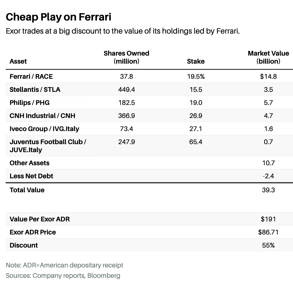 Exor owns stakes in a group of public and private companies, notably a nearly 20% stake in Ferrari, the top luxury car maker in the world. Its shares look cheap.