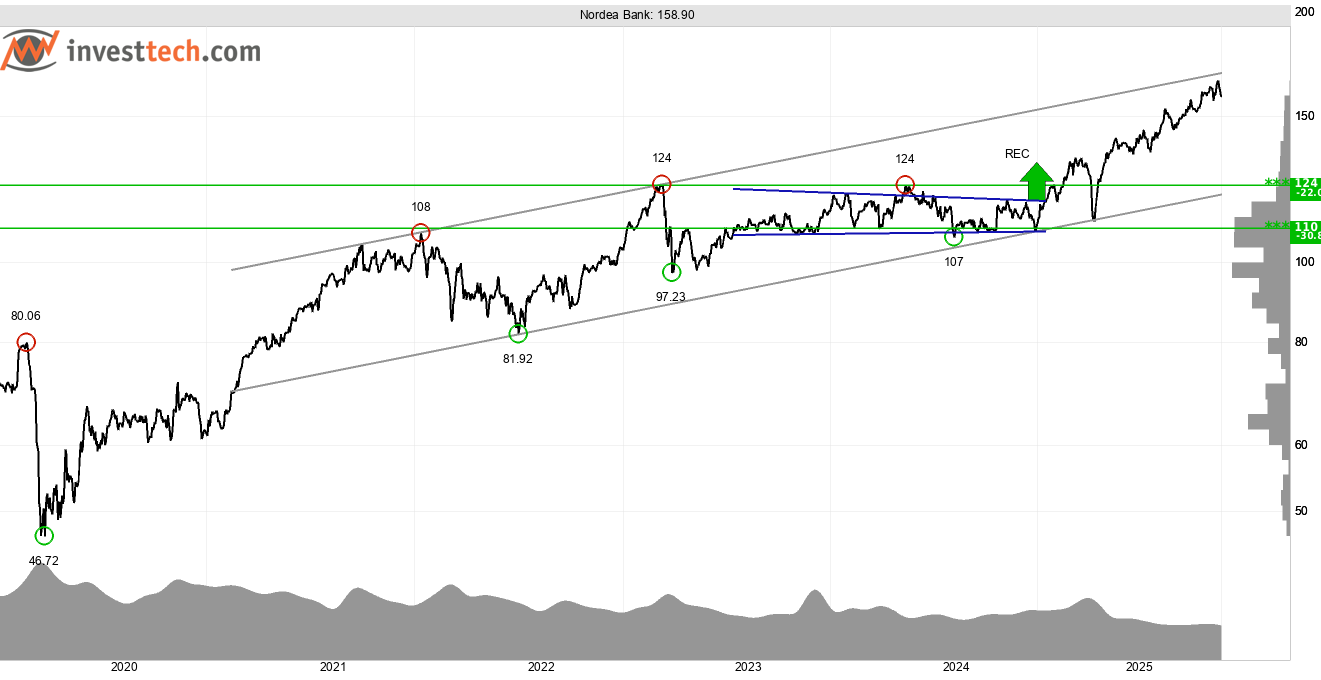 Nordea Bank har som många andra bankaktier en hög direktavkastning med sina 6,5 procent. Med det ligger den tvåa bland storbolagen efter Swedbank A. Sett över tid har aktien utvecklats positivt innanför en stigande trend i grafen på lång sikt. Den annualiserade stigningstakten är 12 procent. Detta signalerar om en stabil utveckling för bolaget och stärker utsikterna för vidare kursuppgång. Ser vi till det kortare tidsperspektivet finns det flera stöd identifierade ned mot 145 kronor. På uppsidan finns motstånd runt all time high vid 163-166 kronor.