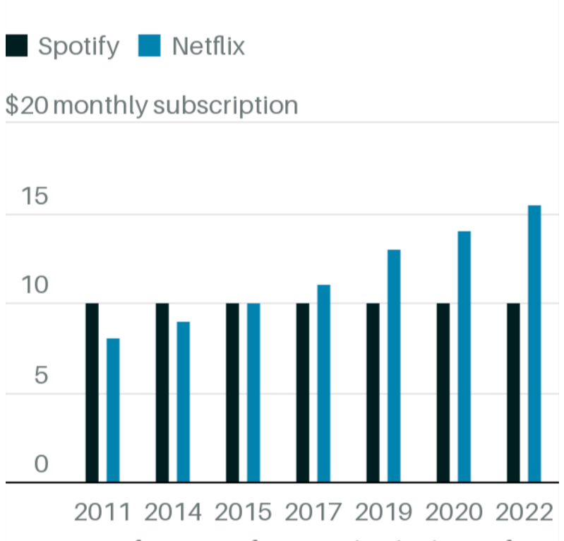 Just adjusting for inflation, the price of a music-streaming subscription should be $13.25 today, said new Warner Music Group CEO Robert Kyncl at a recent investor conference. And in comparison to video streaming, music services are 50% undervalued, Kyncl argued. Between 2011 and 2023—a period when Spotify has stuck to its $9.99 price—the most popular kind of Netflix subscription has gone from $7.99 to $15.49, Morris notes.