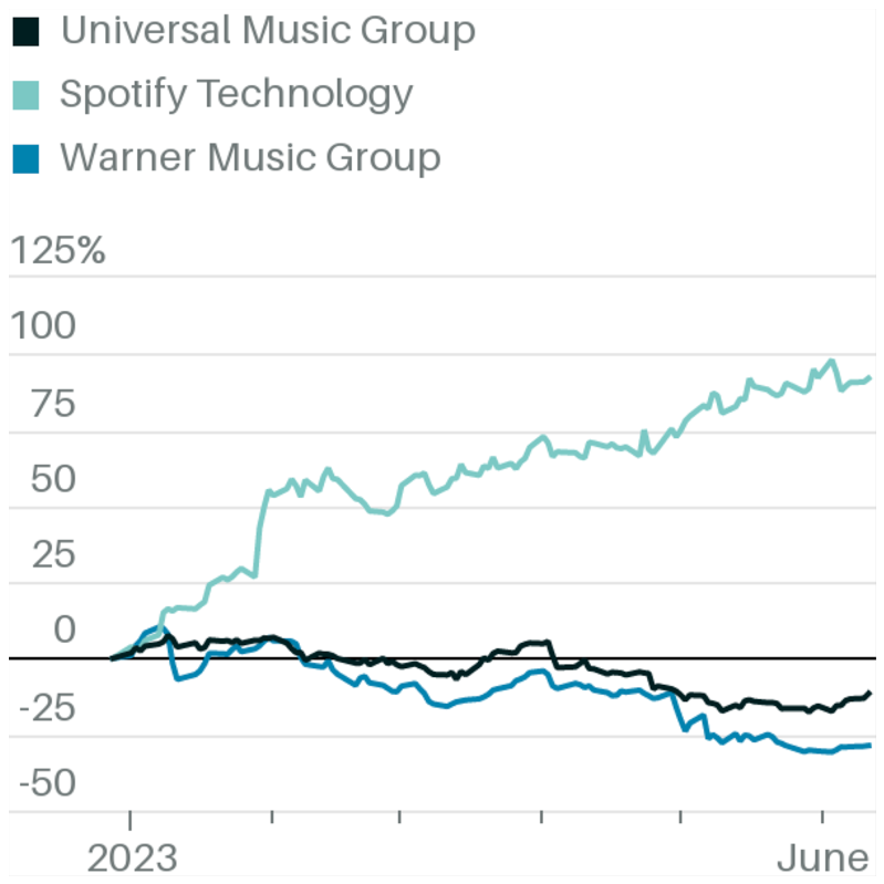 AI may one day be part of a positive case for music stocks. Labels have already used it to enhance songs and even to find promising artists they want to sign. It can theoretically even give new life to long-dead artists: Paul McCartney said this past week that he used AI and an old snippet of John Lennon’s voice to create a new Beatles album, set for release later this year. But for now, AI is viewed by Wall Street as a net negative because it introduces uncertainty into an industry that has enjoyed a prolonged period of competitive balance. The risk AI poses to music is similar to the general, unquantifiable risk of investing in a large tech company like Alphabet (GOOGL) when government regulators are scrutinizing its business: It’s a nagging worry, but leaves few visible dents in the larger positive case for the stocks.